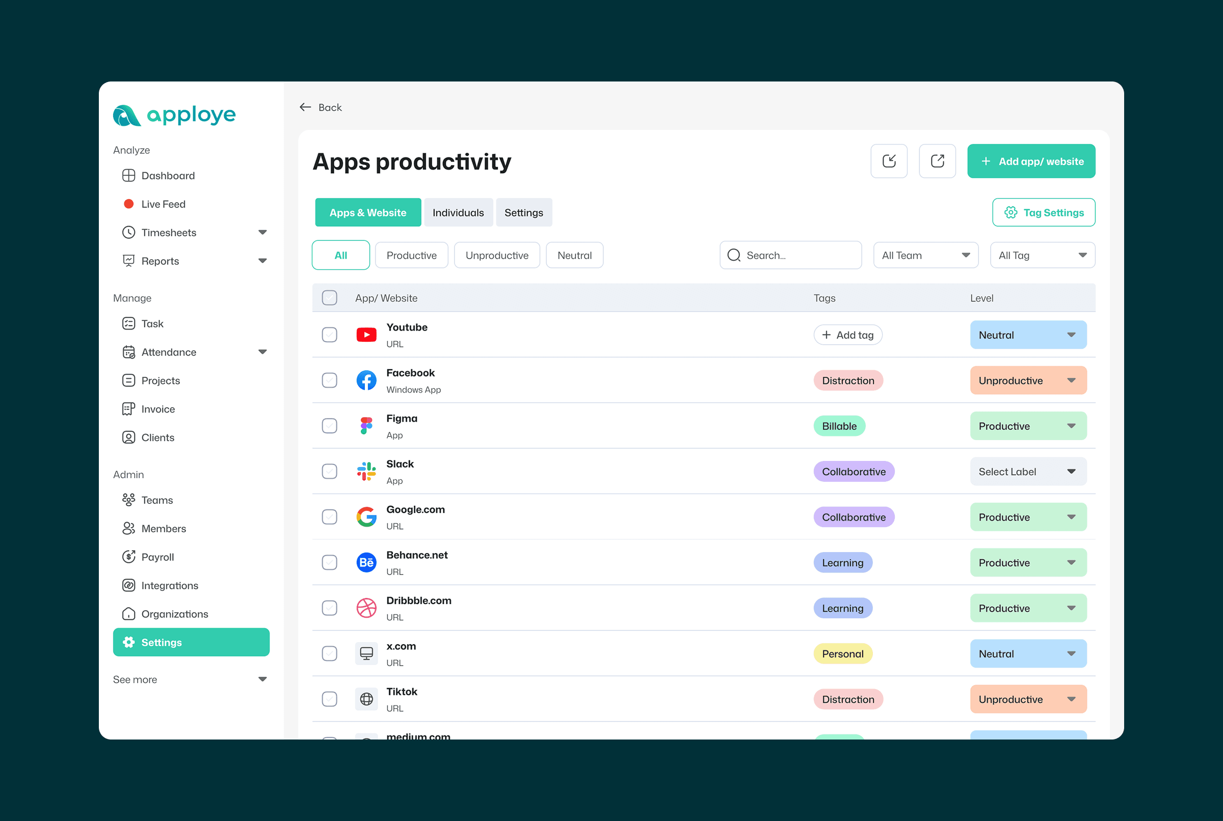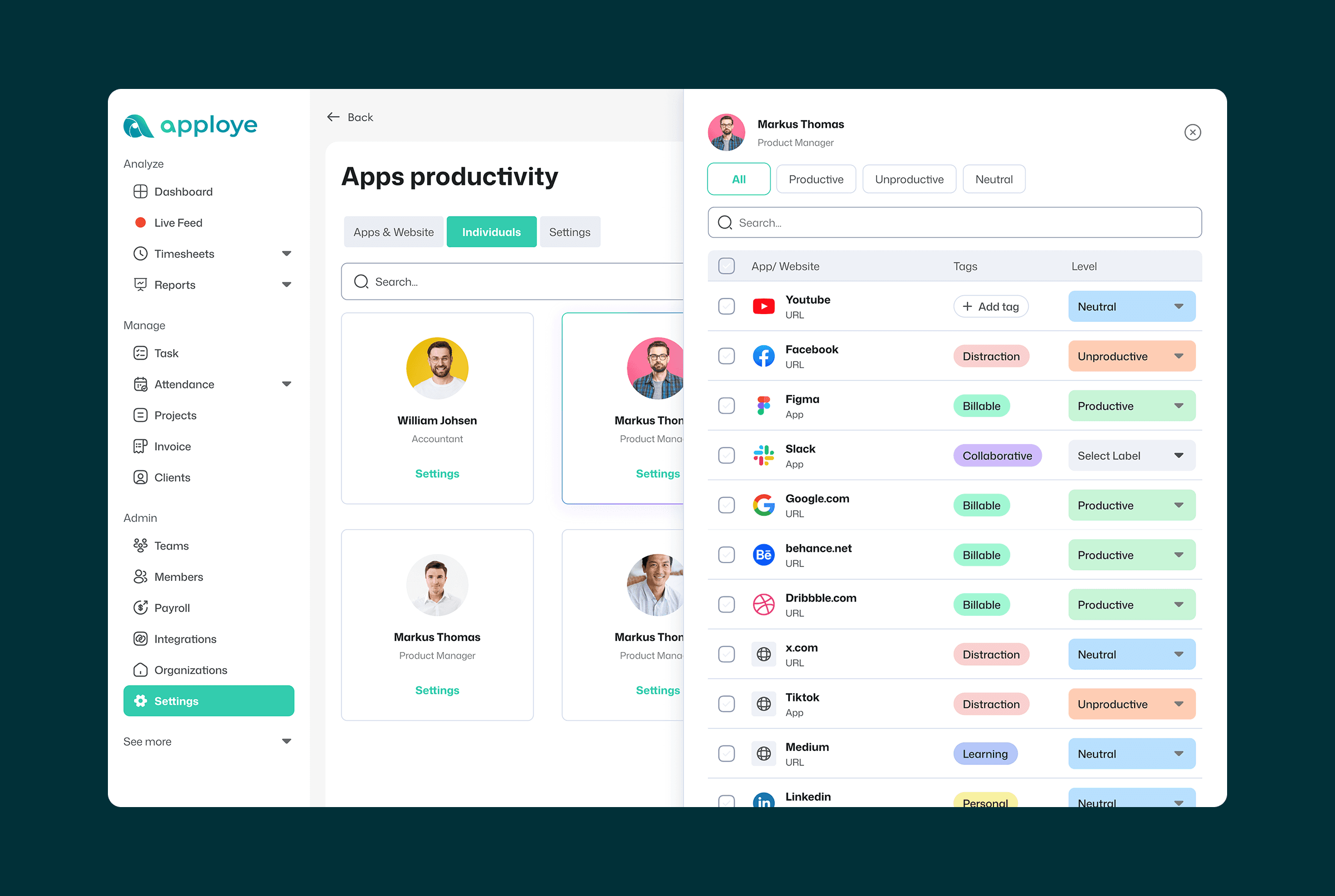 This feature empowers company owners to define what "productivity" looks like for their specific business. By custom-labeling apps and URLs as Productive, Neutral, or Unproductive, managers get a clear, data-driven view of how time is being spent across the organization.