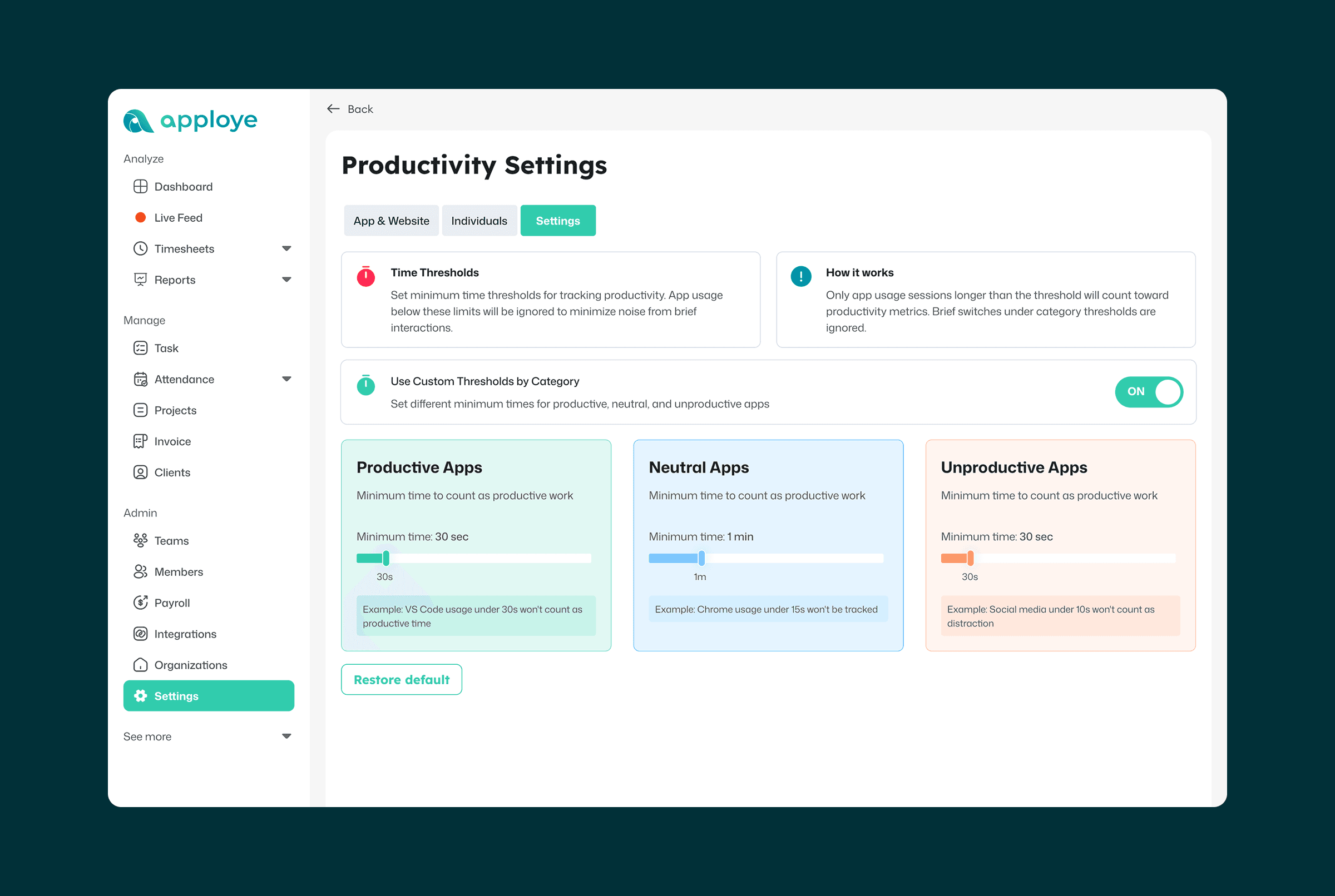 To provide even more precision, We’ve designed a Customized Threshold setting. This allows organization owners to define exactly what constitutes productive time by setting time-based triggers for different app categories.