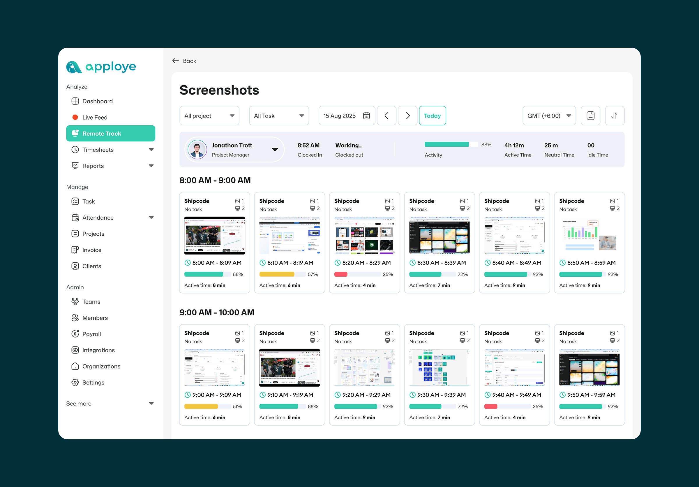 Data Integration: Each screenshot is timestamped and mapped directly to a productivity score, allowing owners to see exactly what was happening during "productive" vs. "unproductive" blocks.
